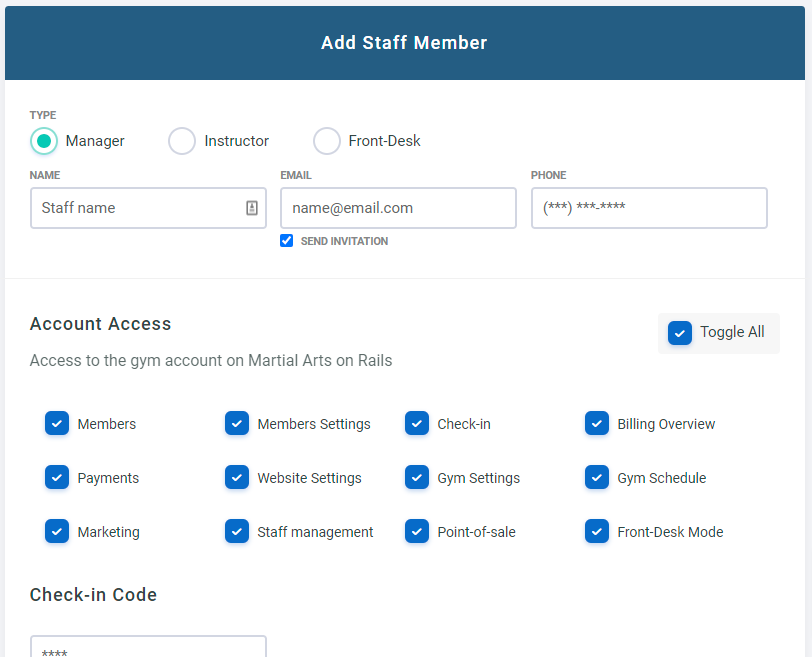 You can provide permissions for managers to access to all the other features, including member management, creating payments and subscription plans for members, attendance tracking, website management and more.