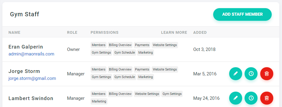 You can manage the staff you have at your gym from the "Managers & Staff" page.
