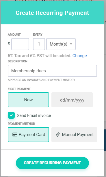 - Tax - If you set up taxes in your billing settings, those would appear here. You can modify the tax rates before adding the recurring payment.