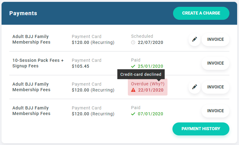 The "Payments" section show the most recent payments on the member's profile, with a link to the full list in the billing section. Upcoming scheduled payments are shown as well, and can be changed before it's due.
