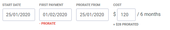 Then click on the "Prorate" link below the payment date, and the system will calculate an additional pro-rated amount from the date you input in the "Prorate from" field.