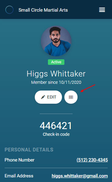 Members can access their membership card by clicking on the barcode icon in their main profile screen: