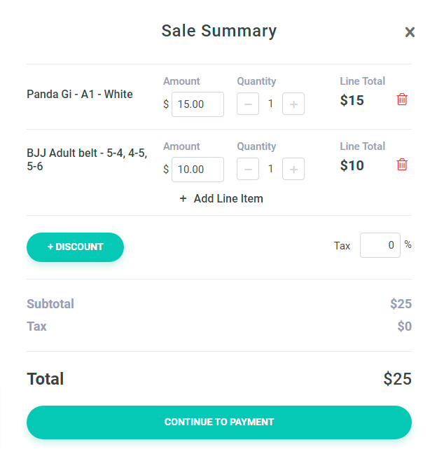 You can also click on the "Add line item" button to add line items without products. Once you add a few items to the sale, you can get to the sale summary by clicking on the cart icon in the top-right corner.