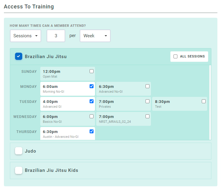 First, we can set how often can a member check-in to class - either unlimited amount, or a limited number of sessions / days per week, month or year or purchase. Once the member has used up their sessions for the term, they will not be able to check-in to class until the next term starts.