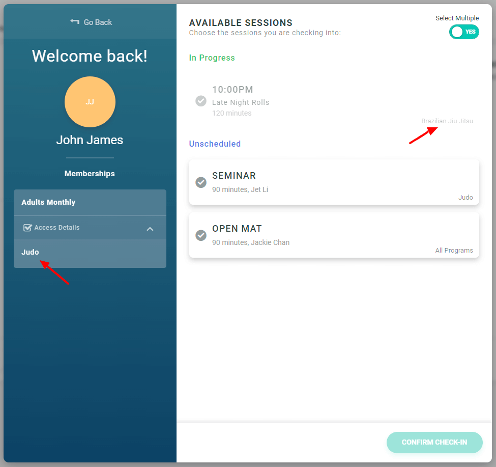In the screenshot above, our member John James is unable to check-in to the "Late night rolls" class, since his membership (shown on the left) only allows access to the "Judo" program, while the "Late night rolls" class belongs to the "Brazilian Jiu Jitsu" program.