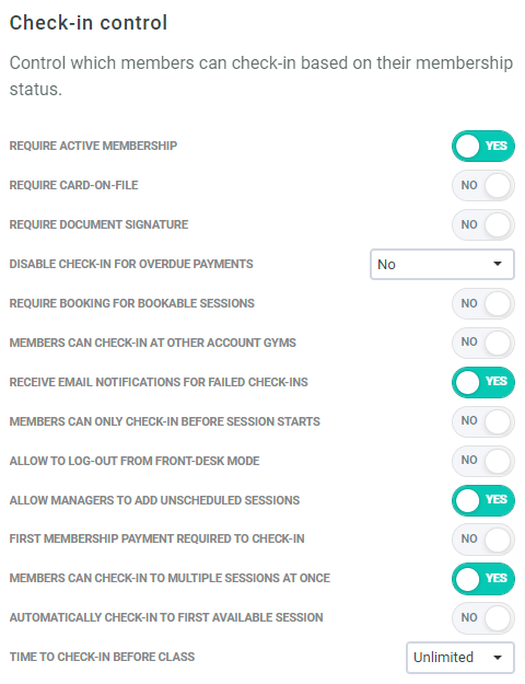 - Require booking for bookable sessions - This option locks sessions that are marked as "Available for booking" to only people who booked it. That means that a member without a booking to a session that can be booked will not be able to check-in.