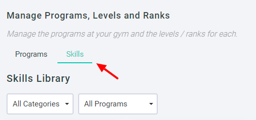 The first step is to set up your skills library. Go to "Gym" -> "Programs" from the main menu, and then click on the "Skills" tab.