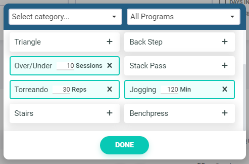 You can filter your skills by program. You can also use the search bar to search for specific skills. Click on the skill(s) you want to assign to the session and click done.