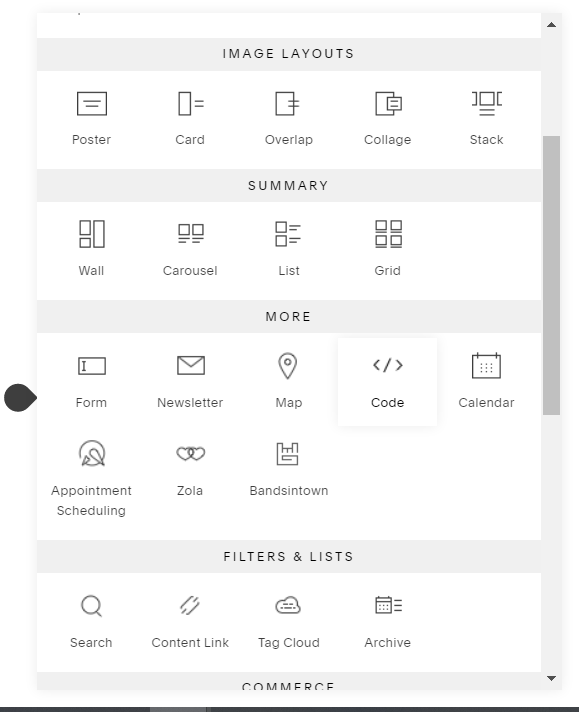 The process for embedding widgets on a SquareSpace website is a bit different than most website editors.