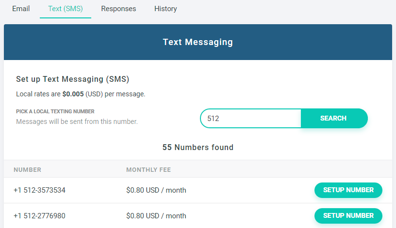 You can search for a local number by the area code. Text messaging rates apply and differ by region. In the example above, the cost per message per recipient is 0.5c ($0.005), and the cost for a monthly number for texting is 80c per month ($0.80 / month). Rates are provided by our text partner, Telnyx. You can cancel your number at any time from the marketing settings.