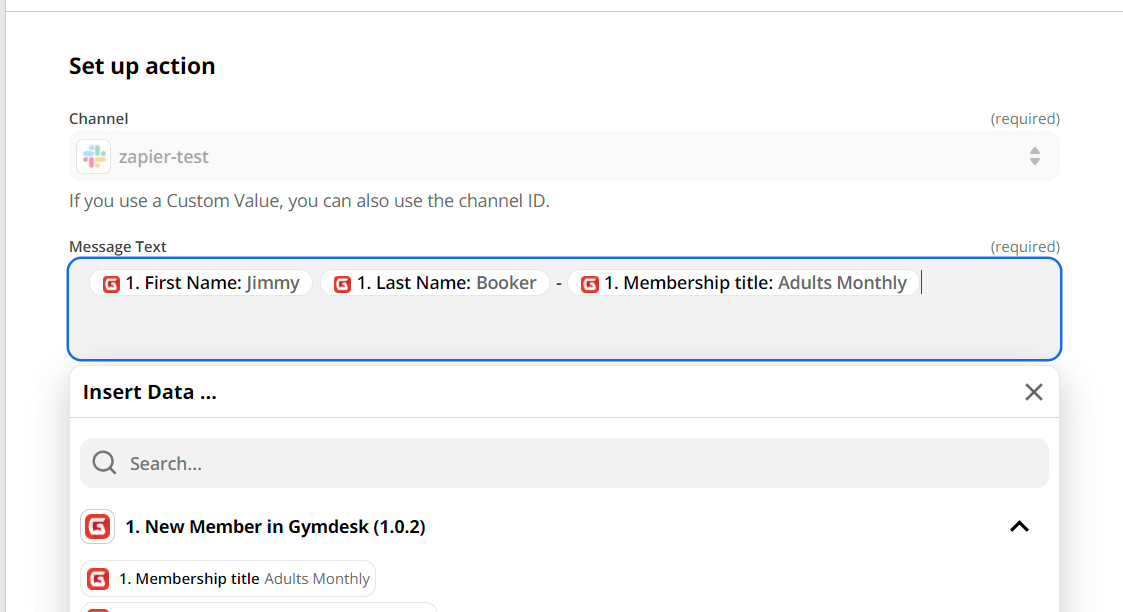 Pick the Slack channel to send the notification to, then in the "Message Text" field you can pick the member data to send to Slack. Clicking on it will show a dropdown with the various fields you can use in your Zaps.