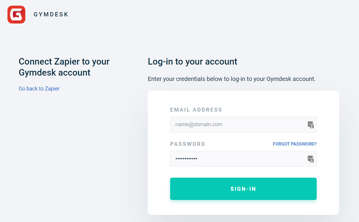 Click "Continue" to move to the next step. On the next step, click on "Choose an account" then "Connect a new account". This would take you to a special log-in page on Gymdesk, where you will pick the account to use with Zapier.