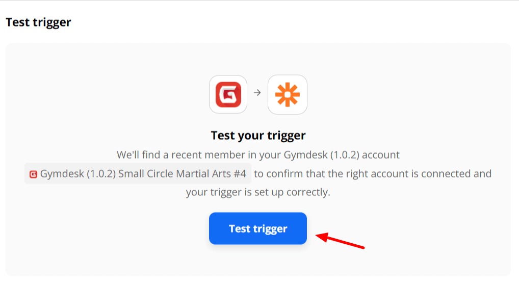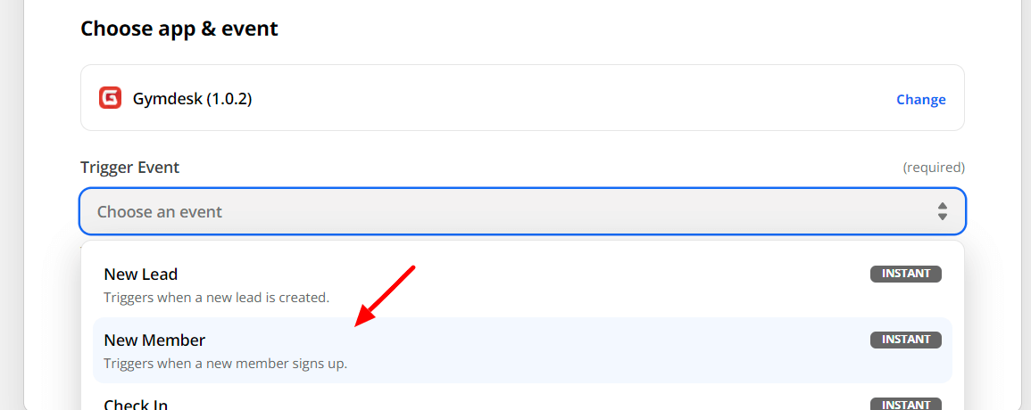Every Zap starts with a trigger - an action that starts the custom flow. This can be an action on Gymdesk or in another service. For this example, we're going to start with an action of a new member signing up to your account on Gymdesk.