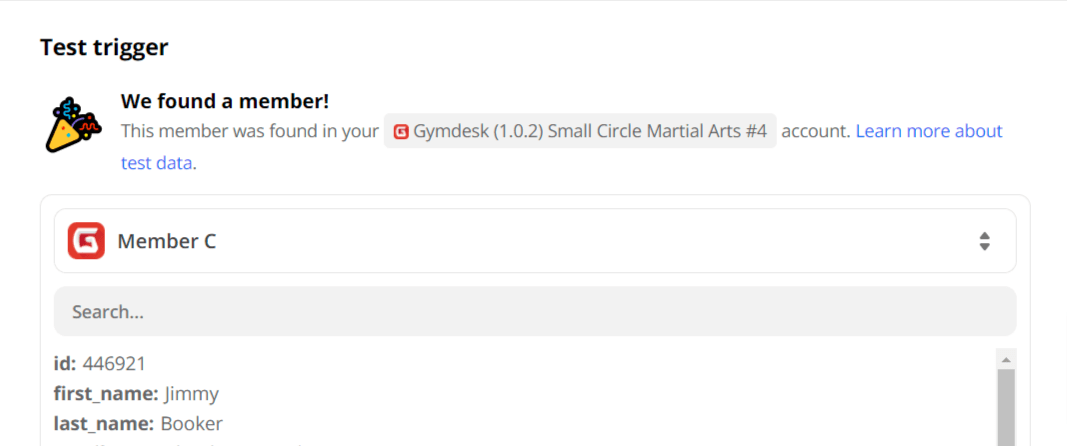 Zapier will let you know if the test is successful. If so, it should be able to pull a member from your account, like so -