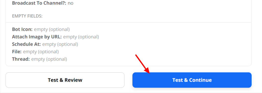 There are other options you can set here, but for our purpose that's all we need. Scroll down and click "Continue". On the next step, Zapier will test the action by sending a message to your Slack.