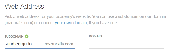 情報を追加する前に、サイトのWebアドレス(URL)を選択する必要があります。Web サイトの設定にアクセスし、サブドメインフィールドに必要事項を入力します。メインのgymdesk.comドメインの下にあるアドレス(サブドメイン)、または独自のカスタムフルドメインをお持ちの場合は、それを使用することができます。